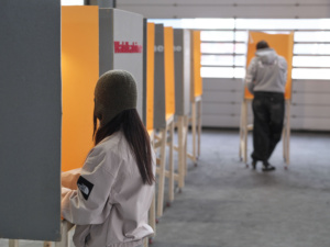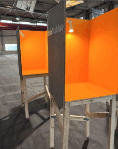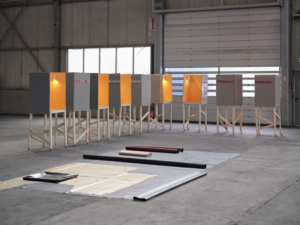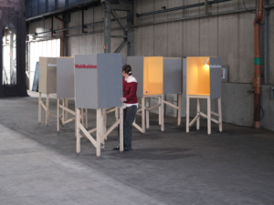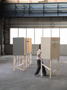 This performative installation unfolds across a grid of nine deliberately crooked voting booths, accompanied