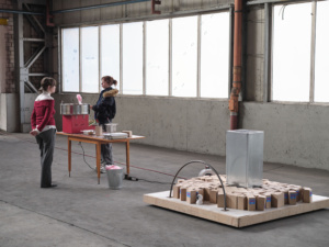 Over the course of a week, the installation is activated daily by a group of eight performers: seven voters and one cotton candy machine operator. The audience witnesses a staged electoral process in which each voter must choose between two fictional “sugar parties.” One party—marked by red, blue, and white—offers a box of sugar in exchange for their vote, illustrating a transactional model of democracy. After casting their ballot, voters take the sugar to the operator, who produces a red cotton candy that tastes deliberately unpleasant. The interaction is humiliating, replicating the moment of disillusionment when a politically motivated “sweet deal” turns bitter.