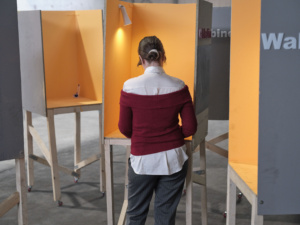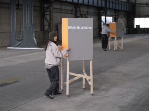 a central table, red and white sugar, a stack of voting ballots, and a ballot box. Each booth bears the word *Wahlkabine* (voting booth) printed in either red or white font—five red, four white—suggesting a coded political alignment.