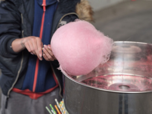 by a mobile cart stacked with boxes of sugar, a functioning cotton candy machine, a surveillance camera,